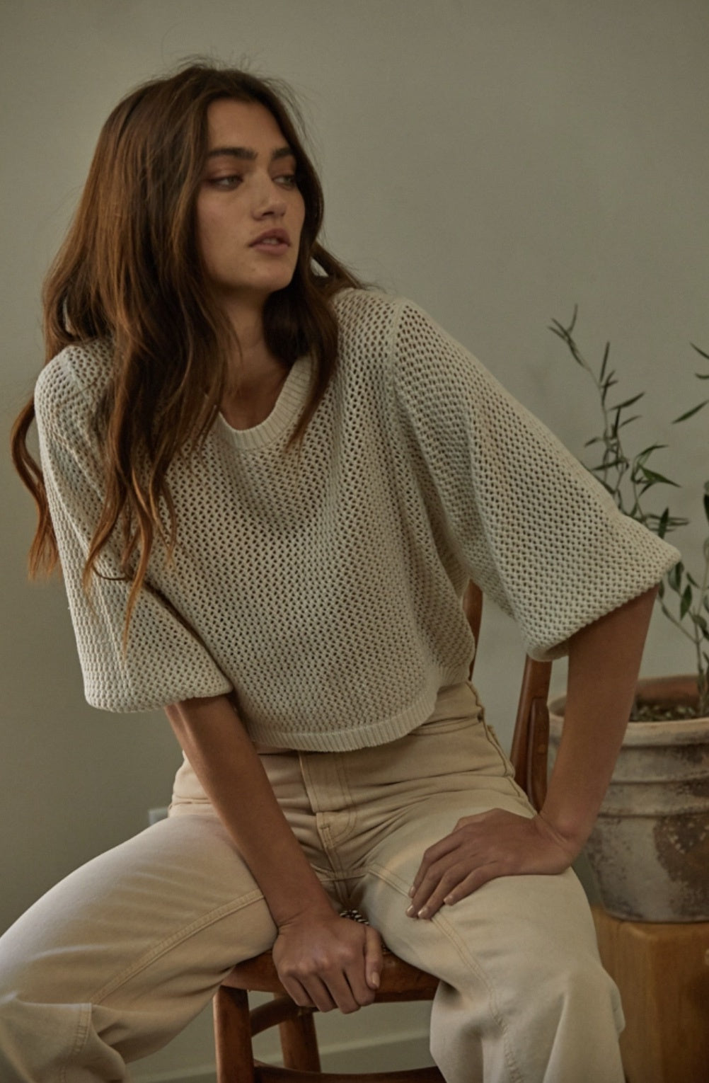 Simple and chic, fall in love with this crocheted sweater, a bit of a throwback feel. This crop top sweater features a 3/4 lenght sleeve with a loose fit to ensure you feel relaxed and stylish all day long - a sweater truly for every season.