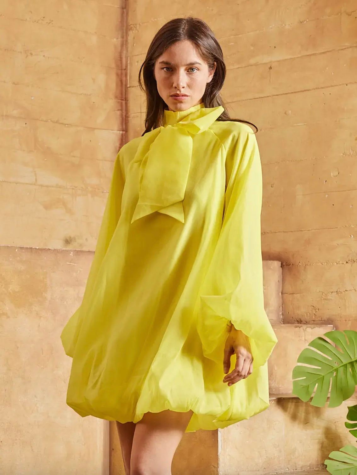 How sweet is this seasonal statement balloon-sleeved dress in yellow? Long-sleeve round neckline accented with a self-tie big lavallière-neck bow and voluminous bubble skirt. Spirited style for a spring or summer bridal shower to the wedding itself. Consider wearing with white point-toe sling backs to sculpted heel sandals.