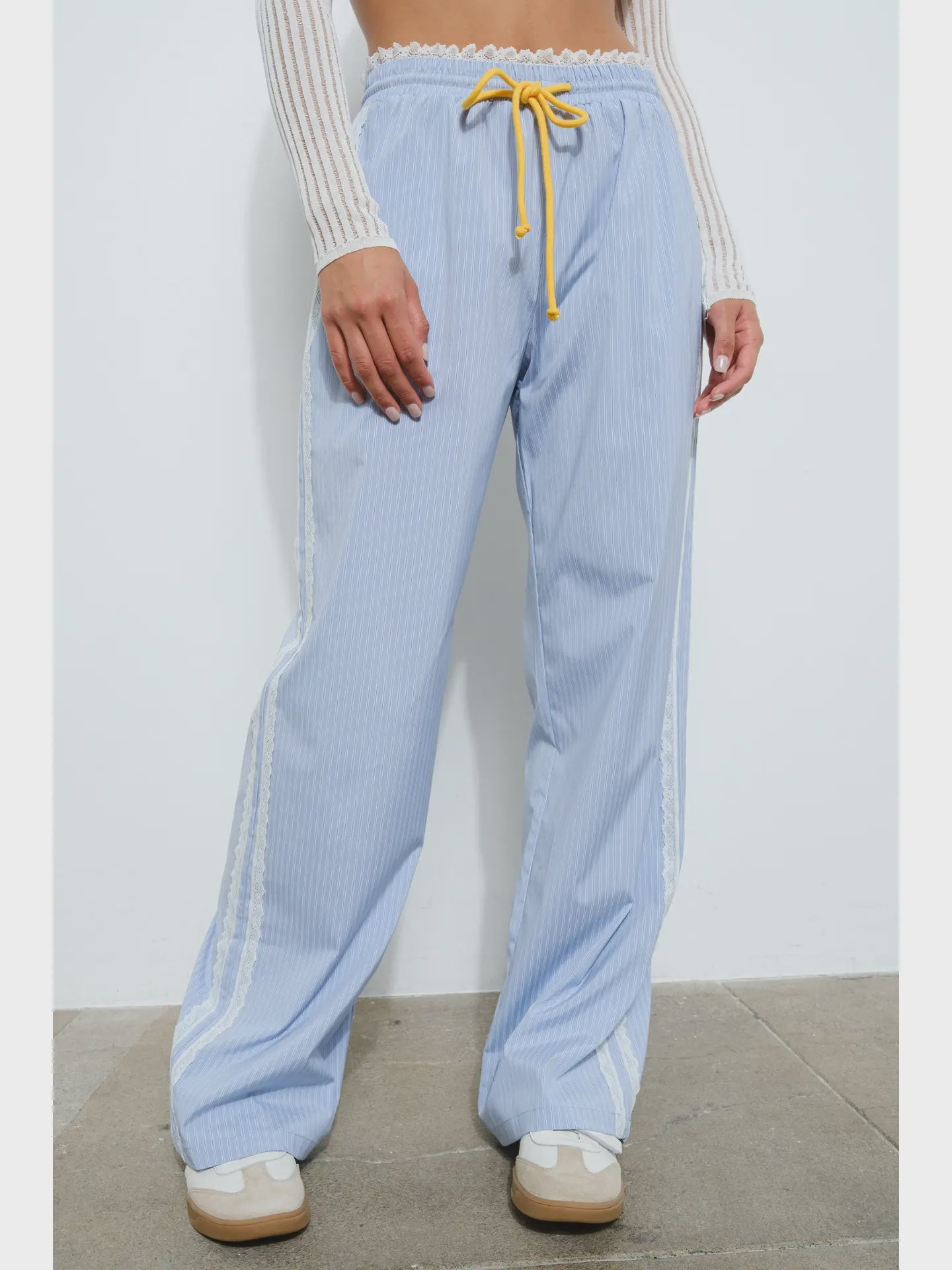 Step up your athleisure game with these Striped Athletic Pants with Lace Trim. Combining sporty stripes with delicate lace accents, these pants deliver both style and comfort. The high-rise waist and adjustable drawstring offer a secure, flattering fit, while the breathable fabric ensures all-day wearability. Athleisure, Elevated.