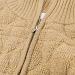 Soft chunky knit bomber jacket crafted from a luxuriously soft and fluffy thick knit in a beautiful camel shade. This chic piece features a convenient zip closure an eye-catching cable knit pattern and elegant gold button embellishments that elevate its overall appeal Perfect for adding a touch of stylish comfort to your wardrobe!