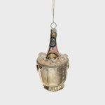 A luxurious glass ornament featuring a miniature ice bucket with a gold champagne bottle, capturing the essence of celebration; ready to toast to life's special moments.  Made of premium glass, this ornament is accentuated with a radiant gold finish, giving it a rich and elegant appearance. Whether it's hung from a tree branch or placed among other table decorations, this ornament brings a celebratory spirit to any setting.