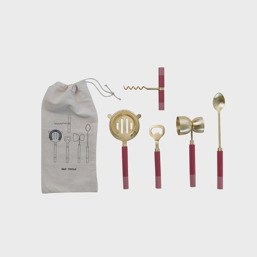 This beautiful 5-piece set of stainless steel bar tools proves that minimal can be in color with rounded resin edges and made with a brass finish that is accented with such a lovely palette of pink.