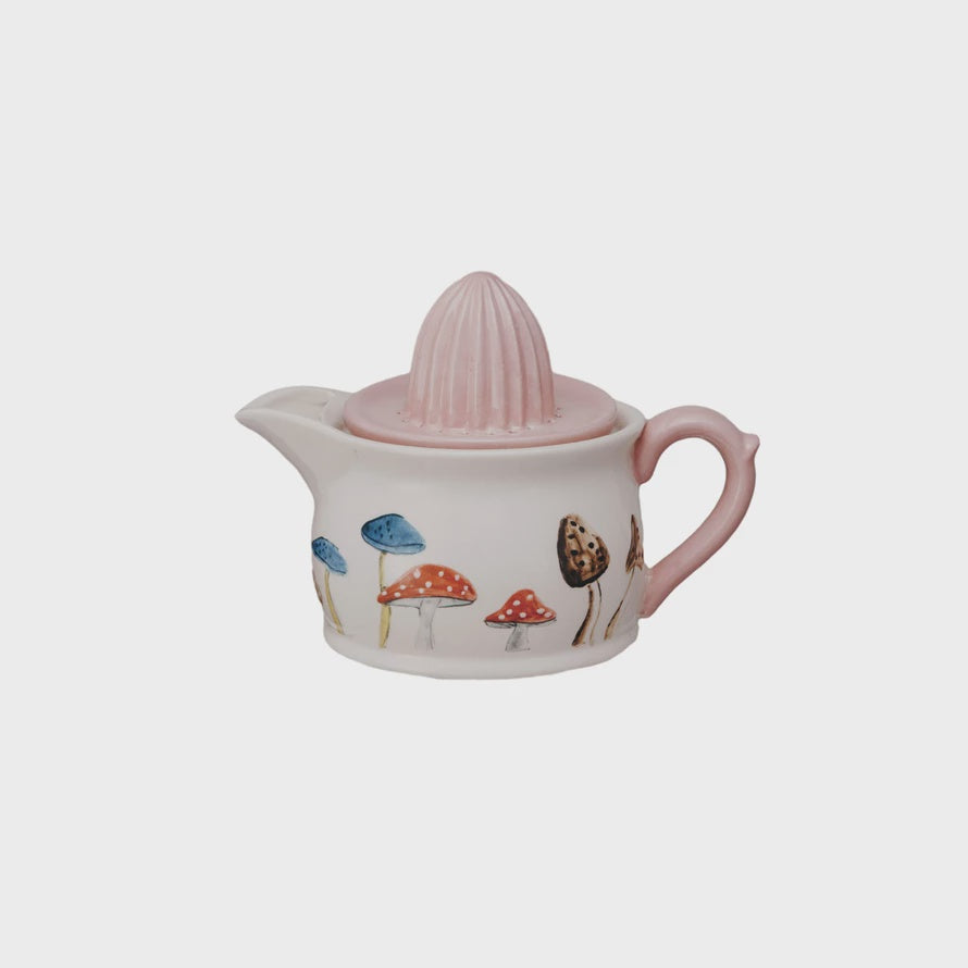 Have you noticed citrus squeezers having their moment on the kitchen-scene as of late? This Pitcher-Juicer Duo, with the hand-painted handle and elongated spout, is ready to drizzle over a warm cake or the perfect pour of citrus splendor! Such a useful gift of accented with the magic of mushrooms and topped with soft pink.