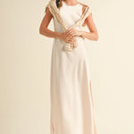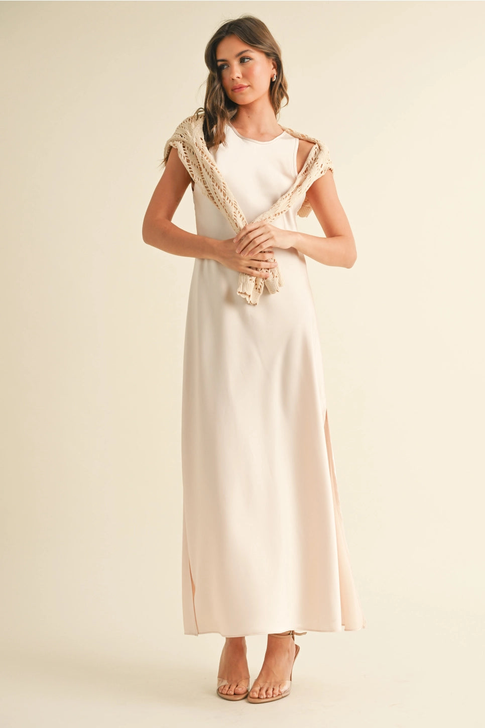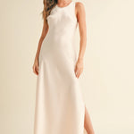 Shine through the season in the Ivory Satin Midi Slip Dress a timeless piece perfect for special celebrations. Its sleek, silky silhouette drapes beautifully for an elegant look, while side slits add effortless movement. For a more relaxed, cozy vibe, layer it with your favorite sweater—instantly turning this dress into a chic, laid-back outfit for festive dinners, winter parties, or weekend outings. A versatile holiday staple that transitions from dressy to comfortably polished with ease.