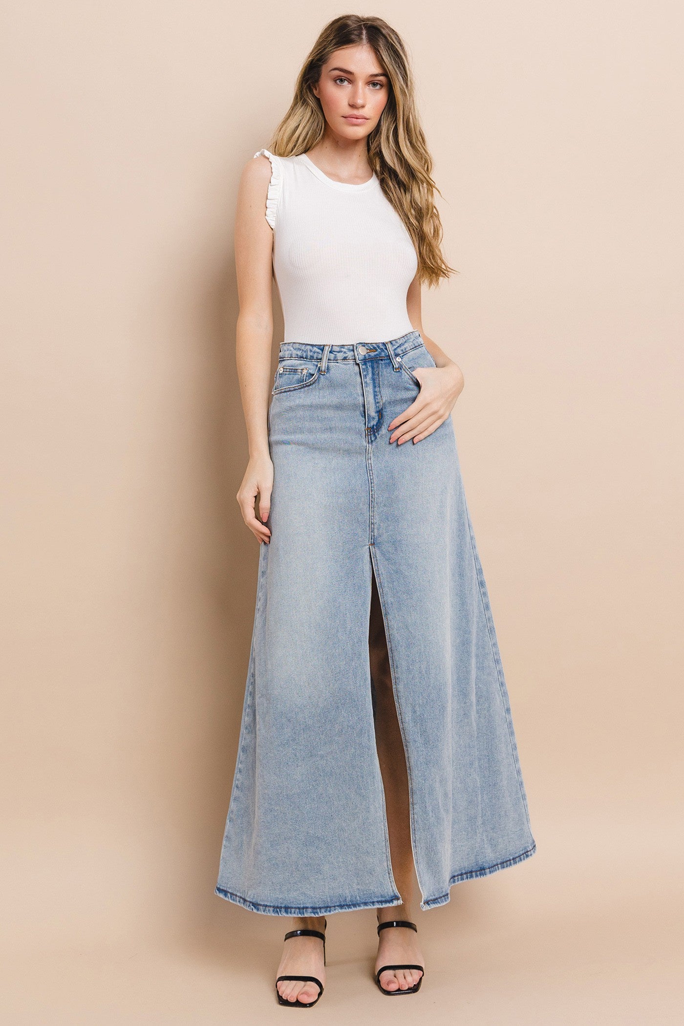 Classic silhouette with a trendy take on the forever-in-style denim skirt. This maxi denim skirt with a high slit gives a moment to move with ease. Pair with a crop top or a crisp white collard shirt. This skirt runs slightly small to be fitted, we recommend to size up for the best fit.