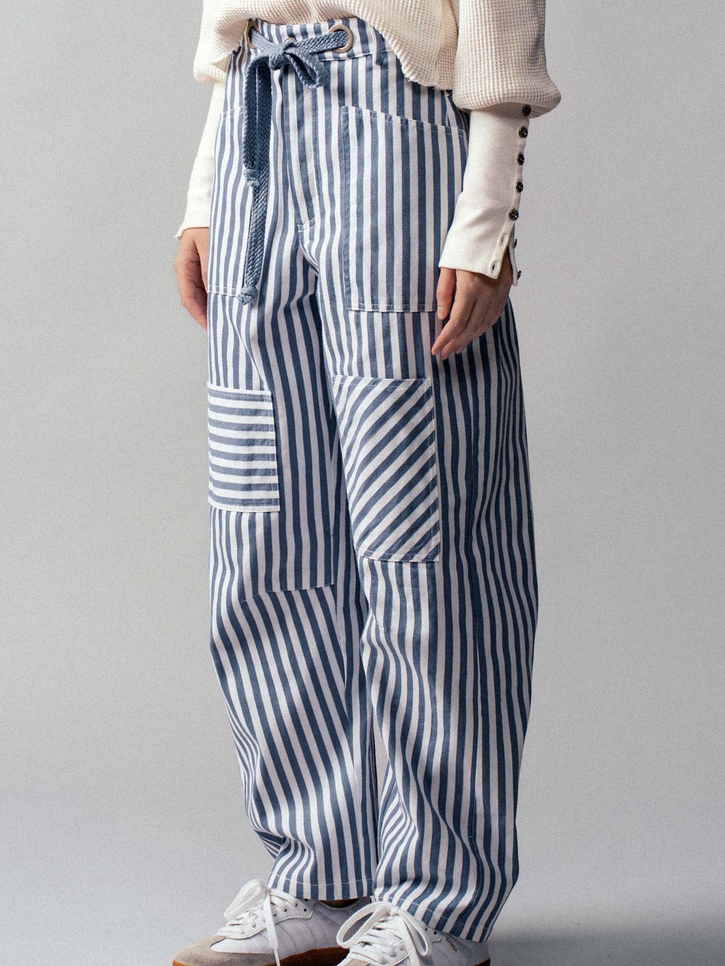 The Railroad Striped Patch Pocket Utility Pants deliver laid-back style with a workwear edge. Designed in breathable cotton, these spring-ready pants feature bold vertical stripes, contrast patch pockets, and a relaxed straight-leg fit. A drawstring waist adds comfort and ease, while the utility-inspired details make them both functional and on-trend. Perfect with sneakers and a tee for everyday wear, or dressed up with a crisp button-down for casual polish, these pants bring effortless versatility to your wardrobe