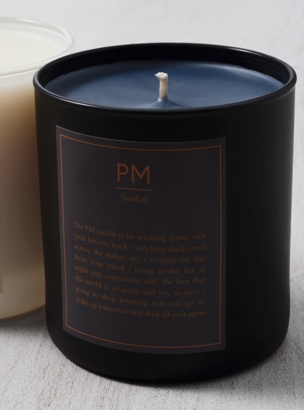 Let this soy candle set the mood for the evening. The PM candle (santal scent) inspires a calm, relaxed mood for winding down at the end of the day. Scented soy candle in 11 oz. clear glass tumbler.