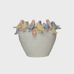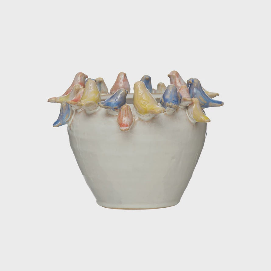 Stoneware Planter with Birds on Rim, Reactive Glaze