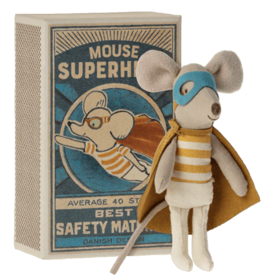 He has an off-white and yellow striped shirt along with his tights, so he can move swiftly through the air. He has a shimmery gold faux suede cape which makes him look extra heroic while flying. He wears a bright blue mask while awake and active, and he even comes with a dark yellow sleeping mask, so can rest peacefully after an exciting day of watching over his Maileg friends. Our Little Brother Superhero arrives in a brilliant and colorful matchbox.