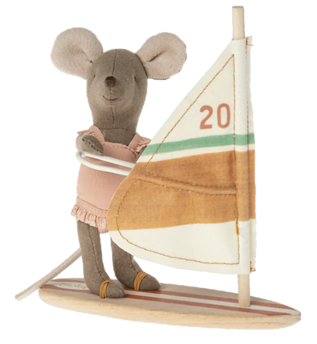 Little sister is learning how to surf with her brother! She’s wearing a ruffled light rose one piece. Her surfboard is red and off-white striped and her sail matches her brother’s, marked with #20. She’s tan and the surfboard includes two elastic straps at the bottom so she can keep her feet in place. She also has magnetic hands, so she can steer her sail wherever she want to go!