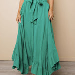 The Touch of Turquoise Maxi Skirt, a vibrant addition to your summer wardrobe. Elevate your style effortlessly featuring a flirty ruffled hem and adjustable tie waist. Making your summer style look with ease.
