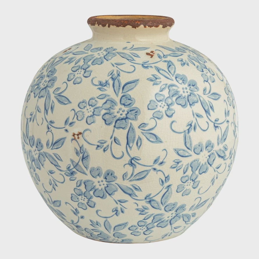 Add timeless charm with the large round ivory and blue terracotta vases—featuring artful antique details and unique transferware patterns inspired by traditional ancient pottery. A beautiful blend of heritage and craftsmanship for your home.