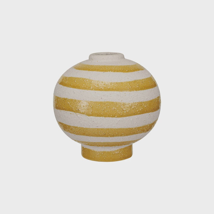 Bring a touch of earthy sophistication to your space with this striped stoneware vase in cheerful yellow and crisp white. The textured finish and narrow opening make it ideal for fresh stems, dried flowers, or even as a pen holder on your desk. Its hand-applied reactive glaze gives each piece unique charm and subtle shine. Whether styled solo or as part of a vignette, this versatile vase transitions beautifully through every season. Add warmth and character to shelves, mantels, or tabletops with this modern-yet-organic accent.