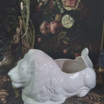 The clean white finish of the white ceramic lion planter makes this piece truly striking. This piece is in "as found" vintage condition with some general wear such as scratches/ scuffs and water stains on the inside of the planter.