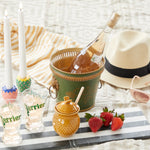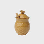 Honey should be served in this yellow stoneware container. It has a wood dipper and the lid has an opening to allow the dipper to stay inside keeping your table and counters clean.