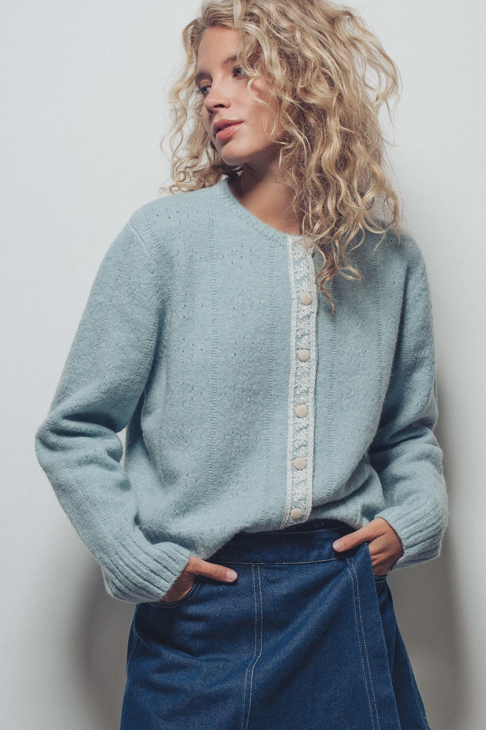 Velvet-covered button closure at front Delicate lace trim along neckline and placket Crew neckline with ribbed cuffs for a classic finish Material: 65% polyester, 13% polyamide, 13% acrylic, 6% wool, 3% spandex Care: Hand wash