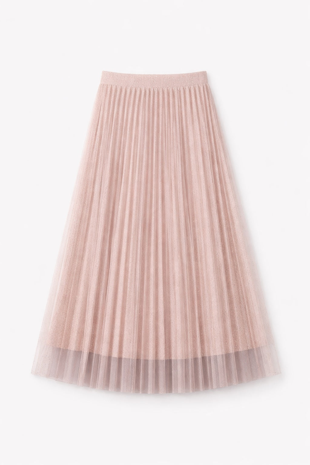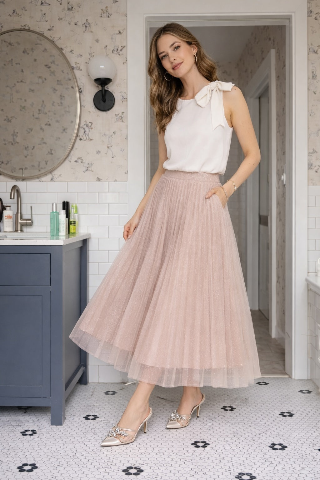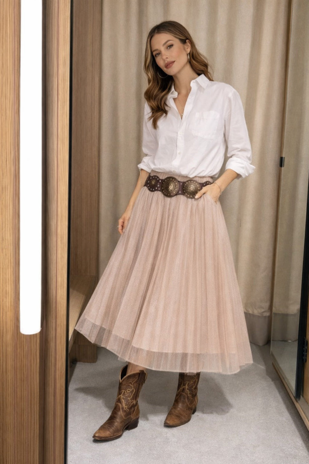 The Blush Pleated Midi is a true day-to-night staple with a distinctly day-to-night feel in a refined neutral palette. Designed with soft shimmer and fluid movement, this lightweight pleated skirt pairs just as effortlessly with a sleeveless blouse and heels as it does with a vintage leather belt and cowboy boots. The comfortable elastic waistband and airy double mesh layers create a flattering silhouette that moves beautifully. Feminine yet grounded, polished yet relaxed, this versatile skirt is made for spring and summer styling—brunch, dinner, events, travel, and everything in between.