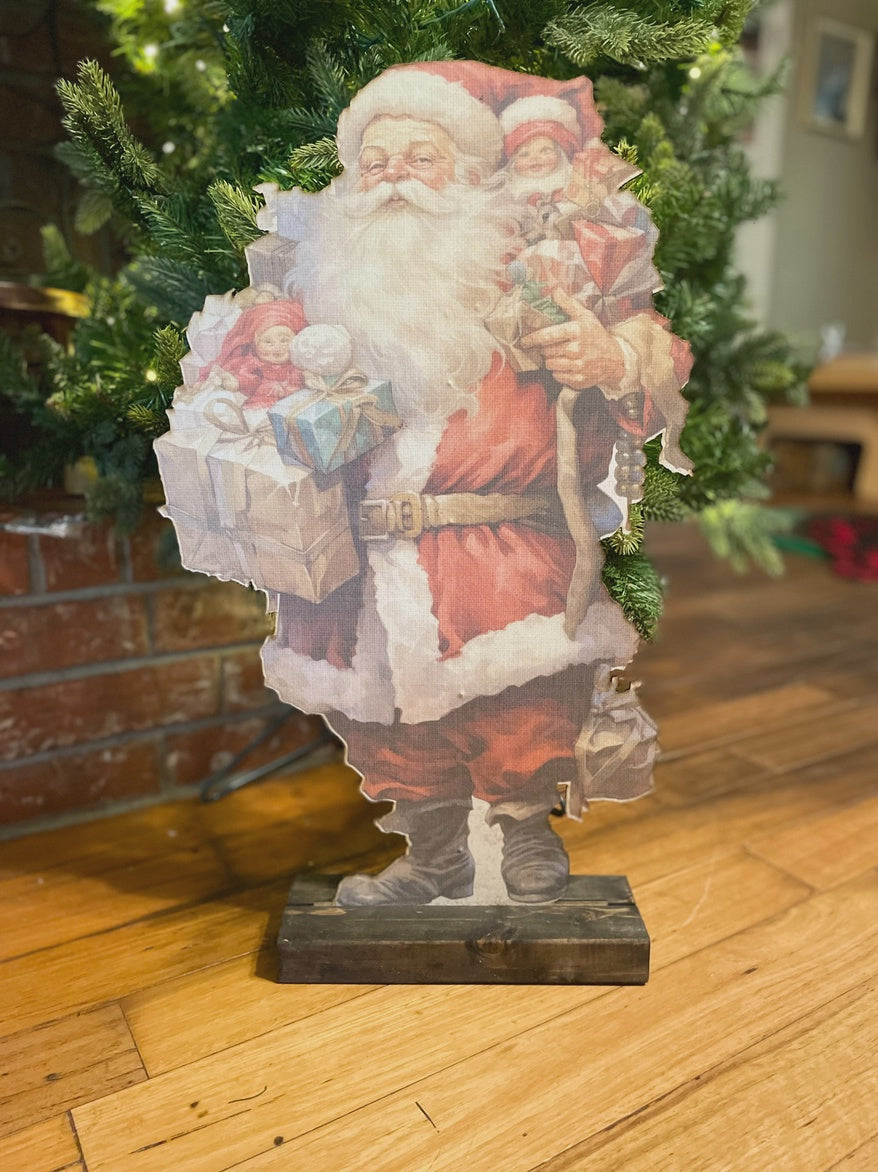 Stand Up Vintage Santa carrying toys. Perfect for around the tree or fireplace. Printed on Canvas and attached to wood base.