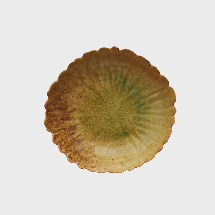 This stoneware platter with a scalloped edge and a reactive crackle glaze is a stunning and functional addition to any home. The reactive crackle glaze creates a textured and glossy effect on the surface, making each piece unique and eye-catching. It can be used for serving a variety of foods, from appetizers and cheese to bread and desserts, or for displaying candles, flowers, or ornaments on a table or countertop.