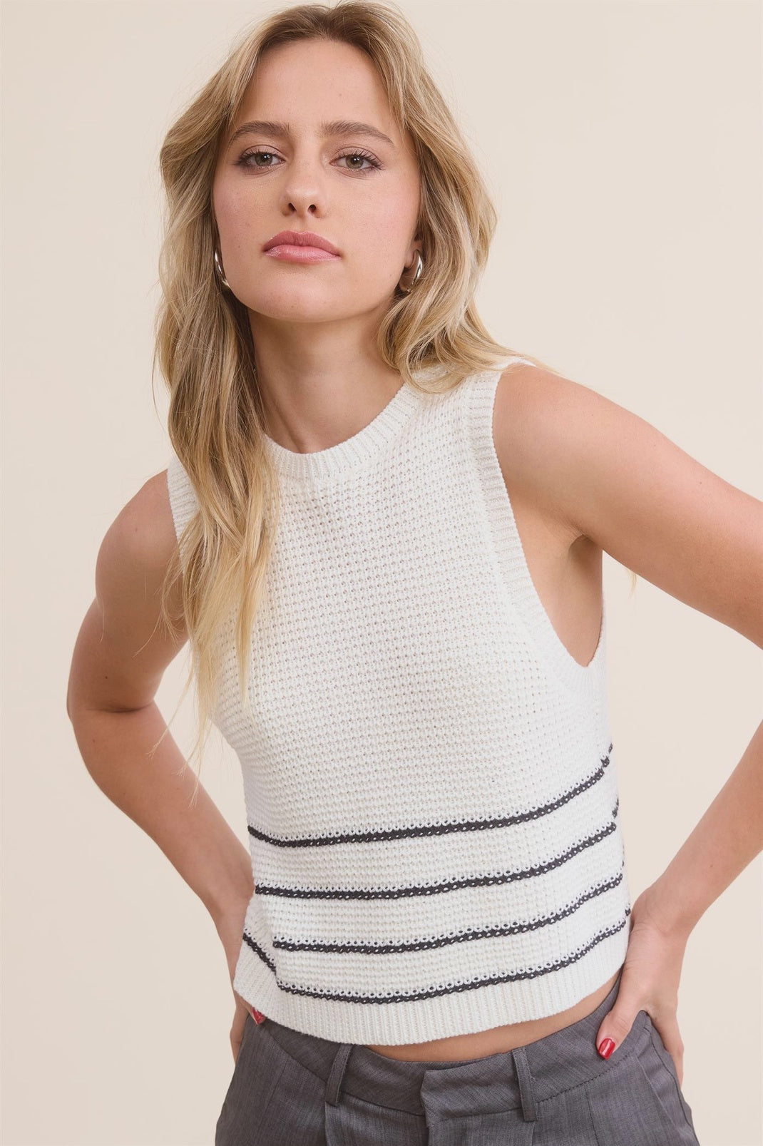 Part of The Lakefront Edit, the Lakefront Stripe Knit Tank captures the relaxed, effortless style of summers by the water. Made of breathable textured knit with a flattering cropped silhouette, this sleeveless sweater tank features classic horizontal stripes in a lightweight yet structured knit; it’s perfect for warm days by the lake or layered under jackets on cooler evenings. Style it with relaxed denim, tailored trousers, or easy shorts for a versatile look that moves seamlessly from lakefront strolls to city outings. Available in three versatile colorways, it’s an essential knit for modern summer dressing.