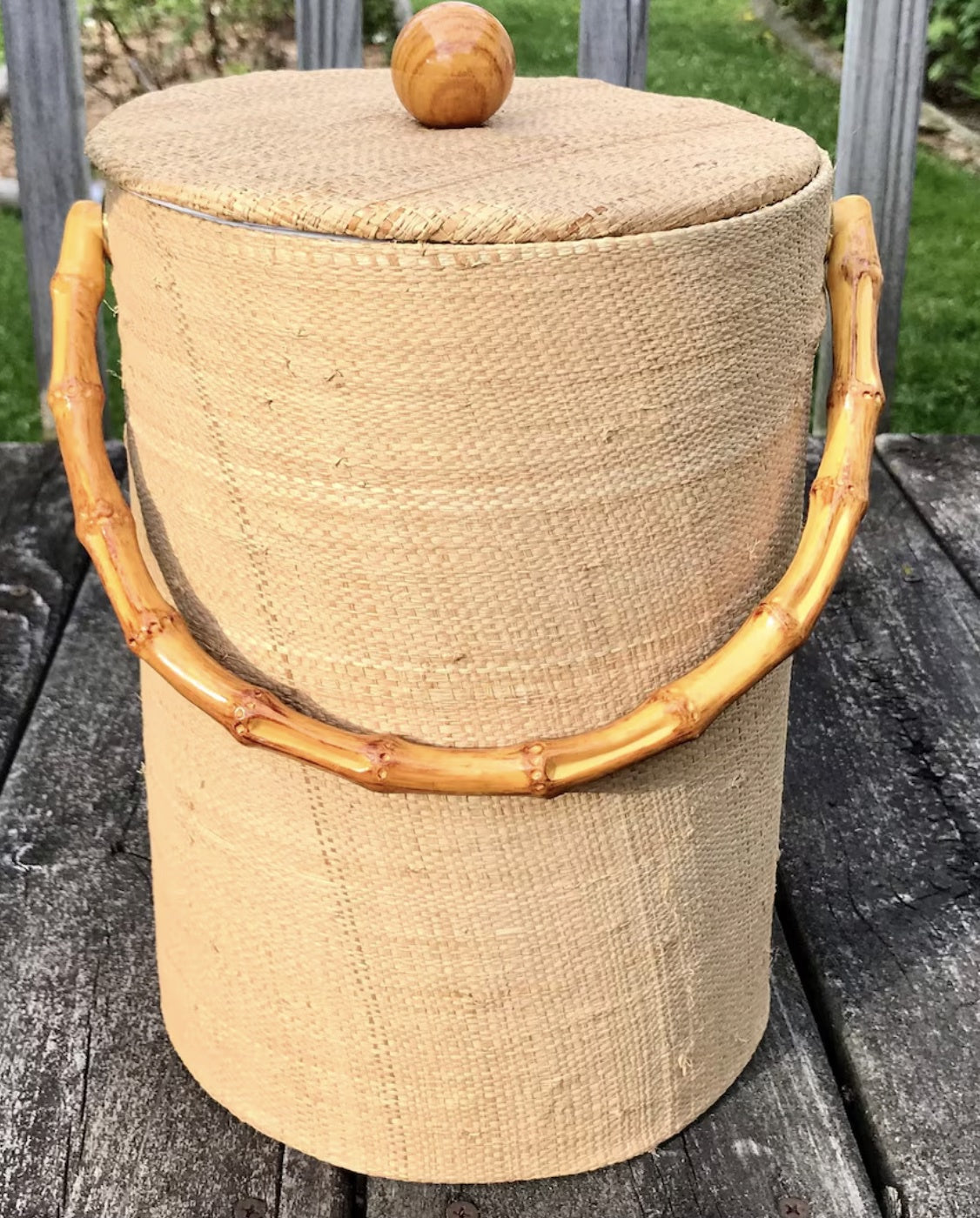 Vintage, Mid-Century ice bucket with lid. Serve in retro style with this Vintage Mid-Century Ice Bucket—wrapped in grasscloth with a bamboo-style handle and matching lid. The perfect tiki barware accent for summer entertaining and classic cocktail hour charm.