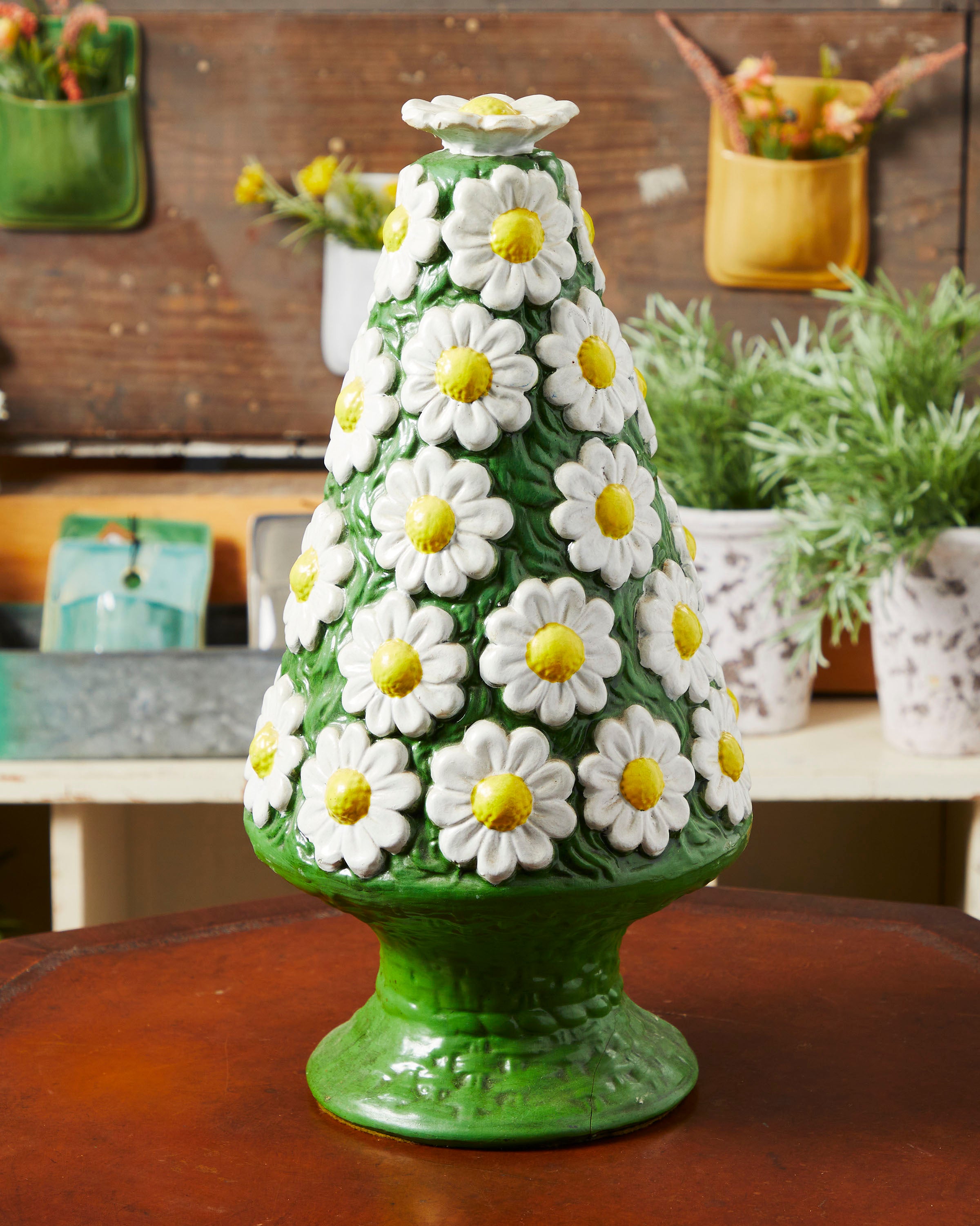 Such happiness in this beautiful vintage Italian Daisy Tree. The Italian Art Tree is full of flowers and finished with a green pot with basketweave design.