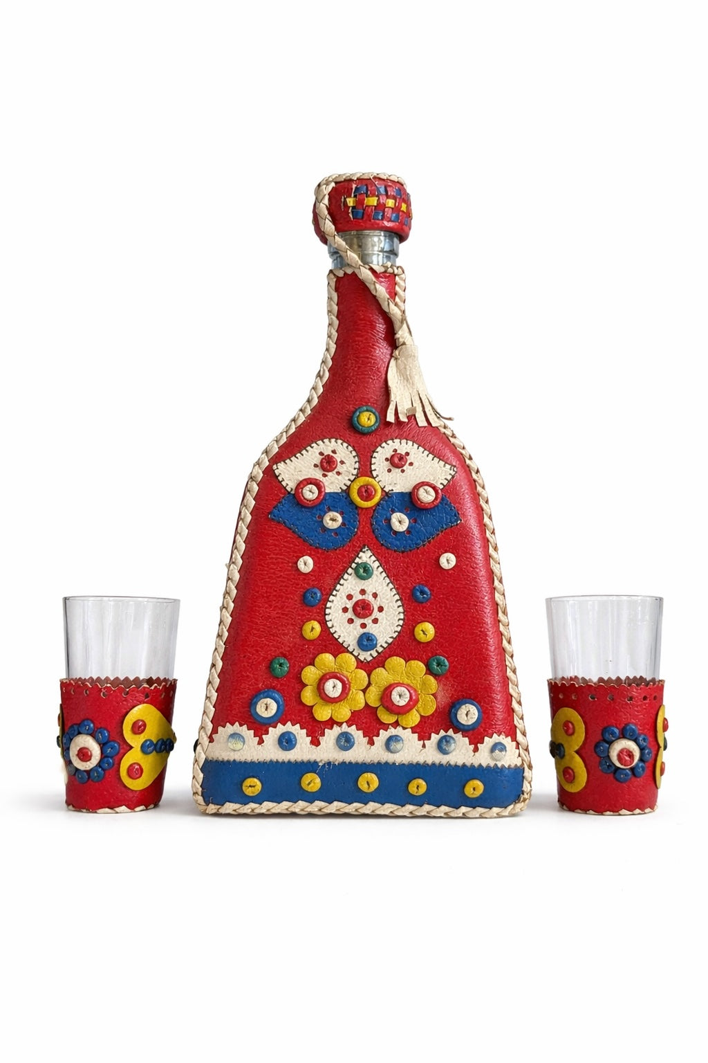 Discover this vintage 1970s red leather decanter set featuring intricate folk art appliqué detailing and two matching shot glasses. Handcrafted with braided trim, colorful stitched motifs, and bold primary accents, this collectible barware set blends rustic charm with mid-century character. A statement piece for entertaining, cabin décor, or eclectic bar styling, it adds warmth and heritage craftsmanship to any space. Ideal for vintage lovers and collectors of unique handcrafted pieces.